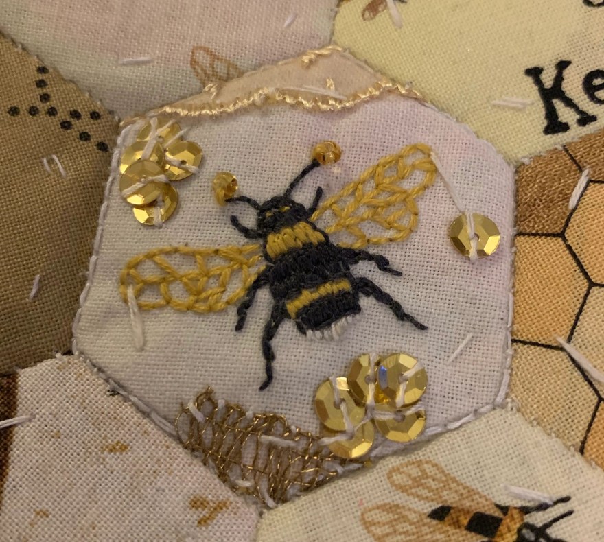 This is just an example of one the more special hexies I’ve included in my quilt, an embroidered bee on calico.