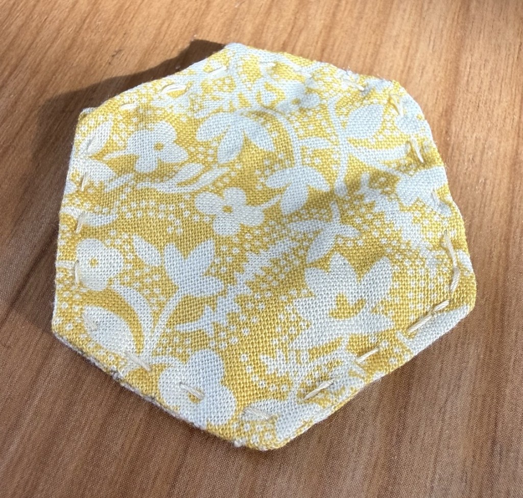 I put two of my hexagons from my EPP project together so she could sew around them. I thought we could turn it through, and have a cute lil’ hexi.