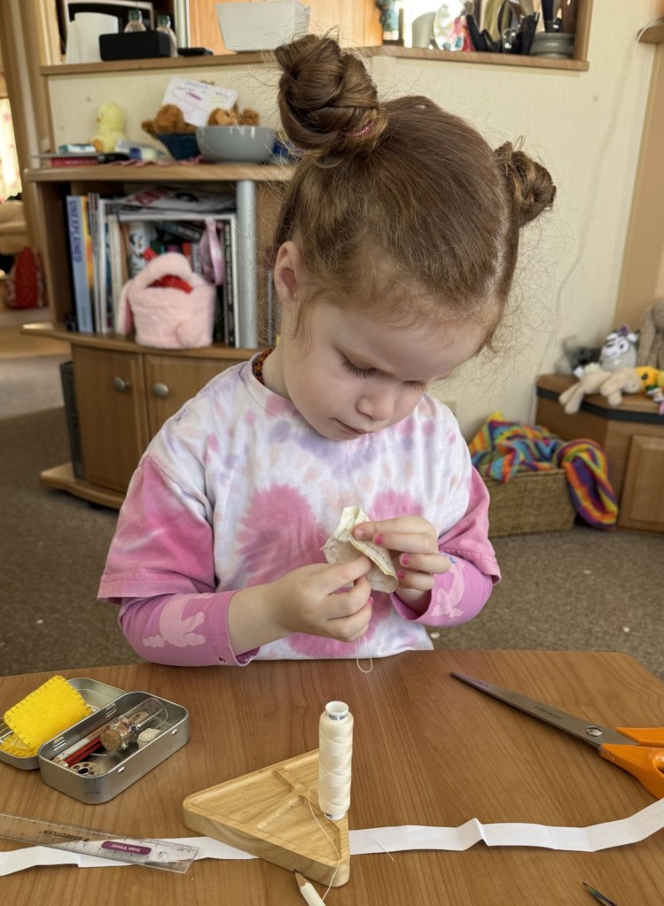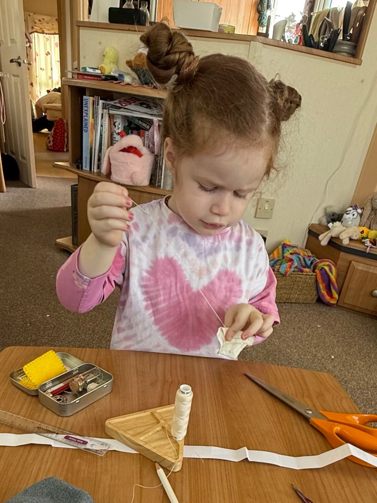 My daughter wanted to help with sewing yesterday. We’re away at the moment so I was trying to shorten my son’s new jeans by hand as no sewing machine and of course my 3yo wanted to help!