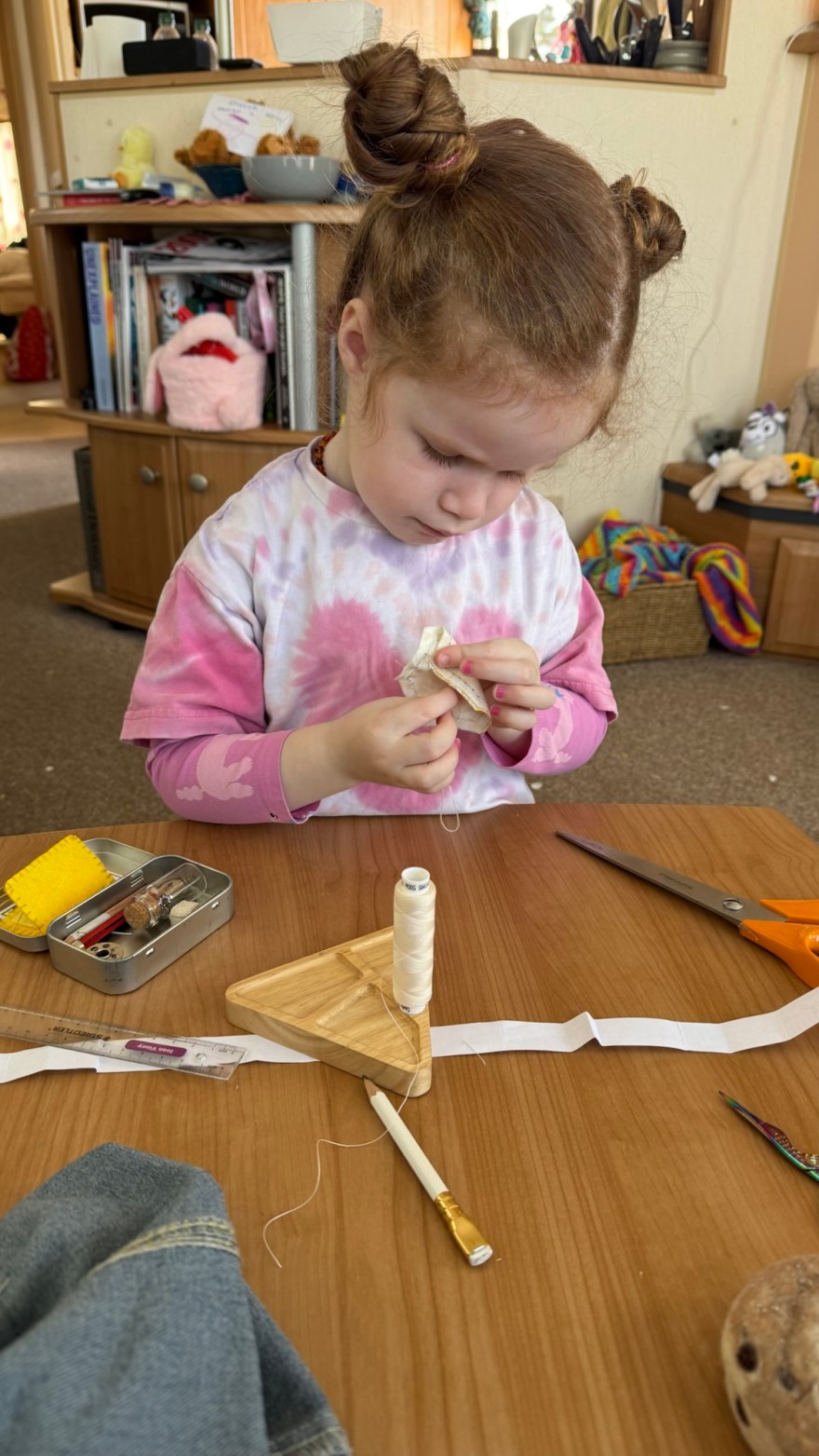 My daughter wanted to help with sewing yesterday. We’re away at the moment so I was trying to shorten my son’s new jeans by hand as no sewing machine and of course my 3yo wanted to help!
