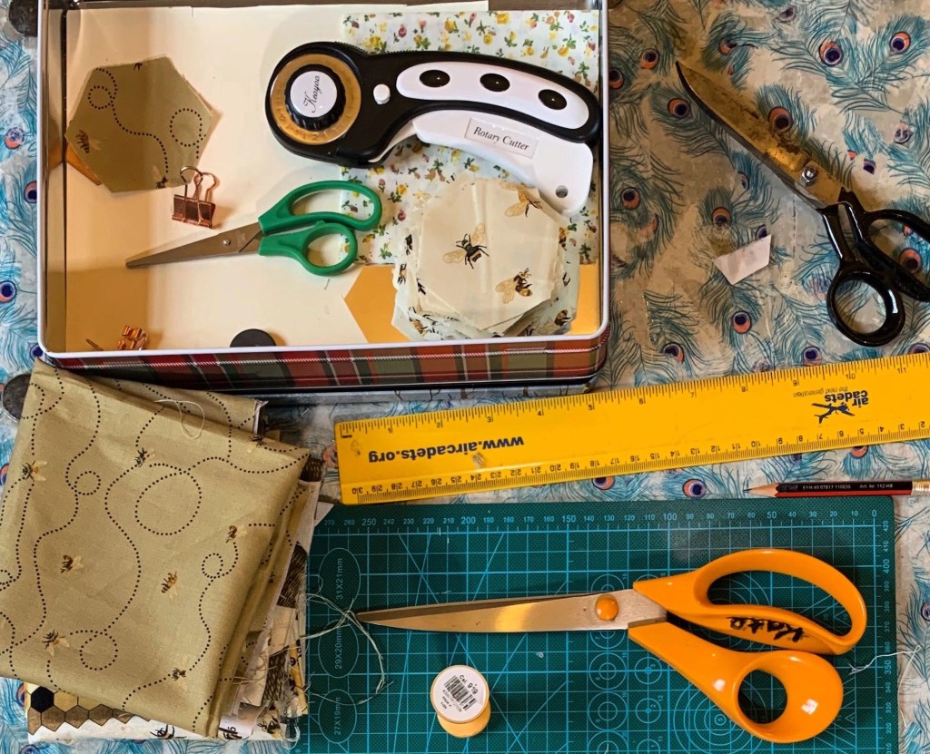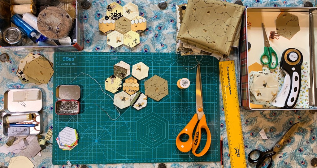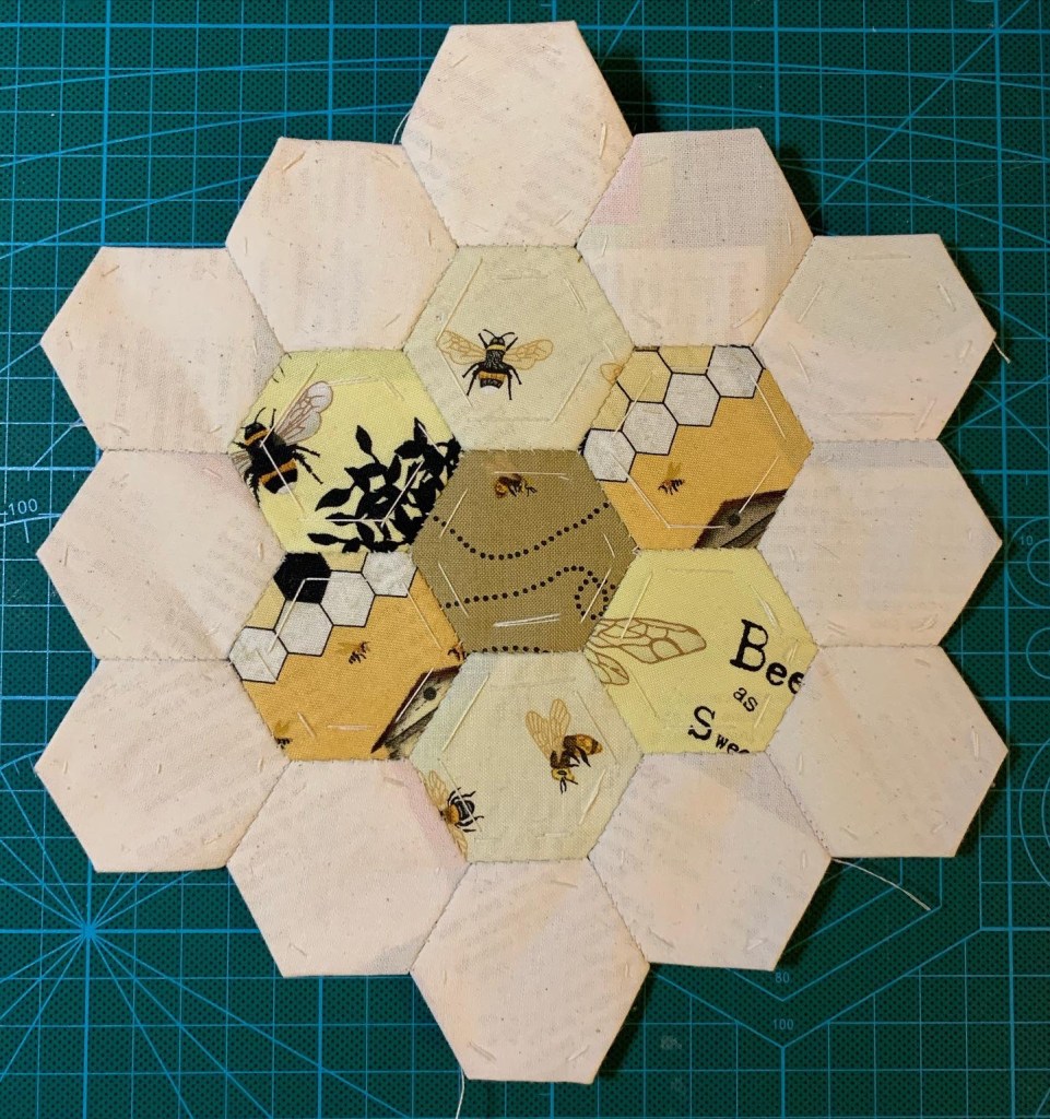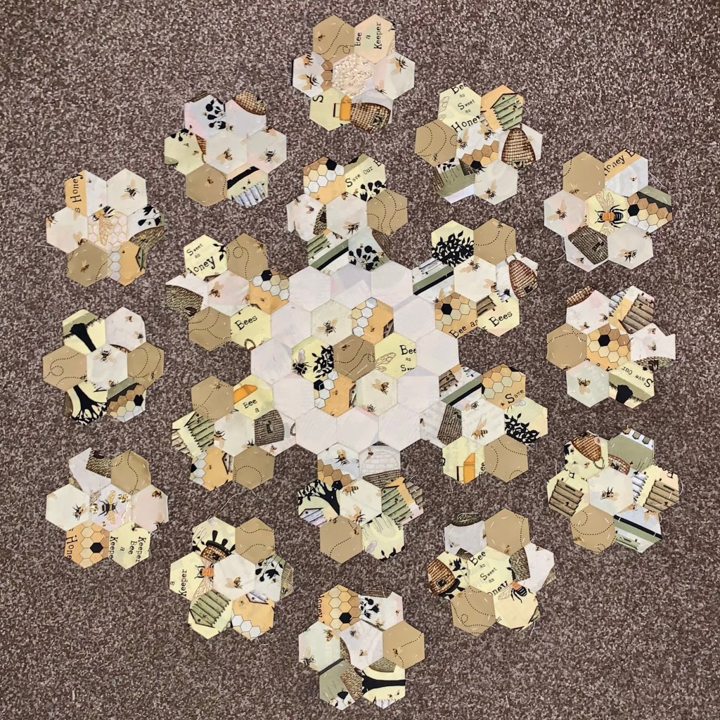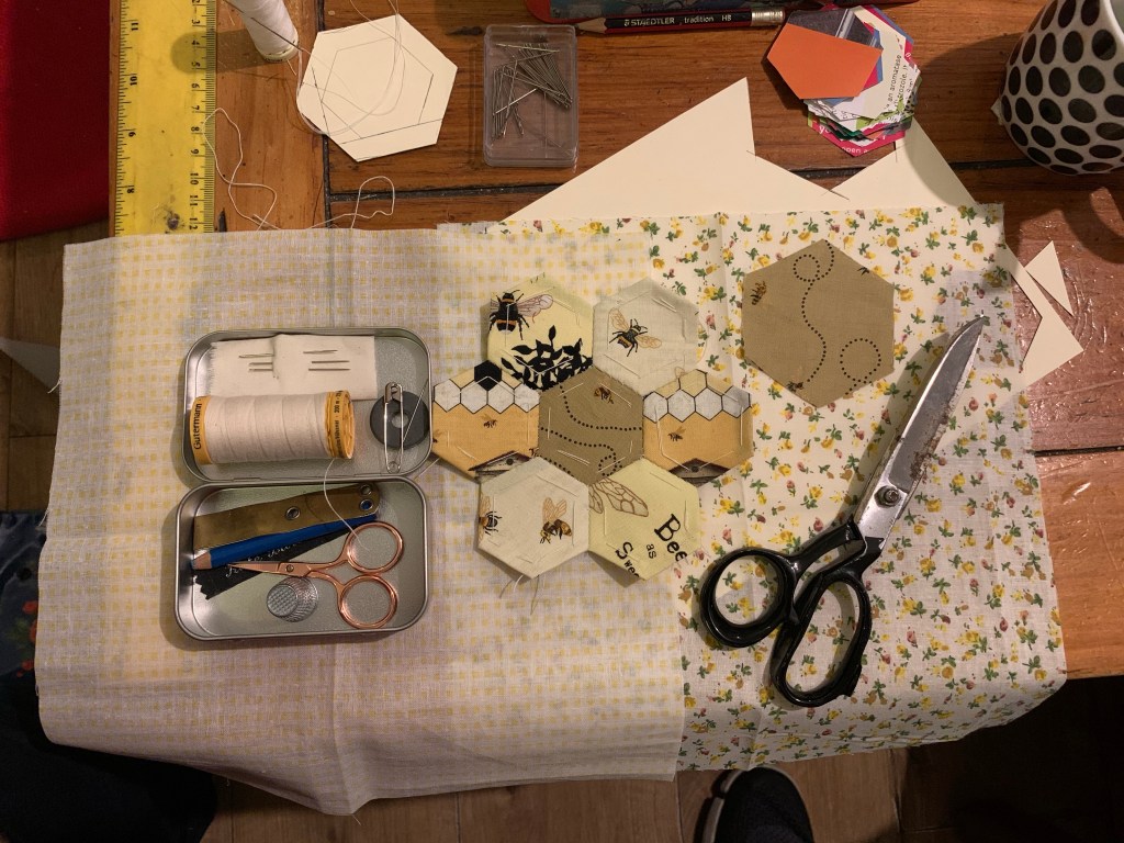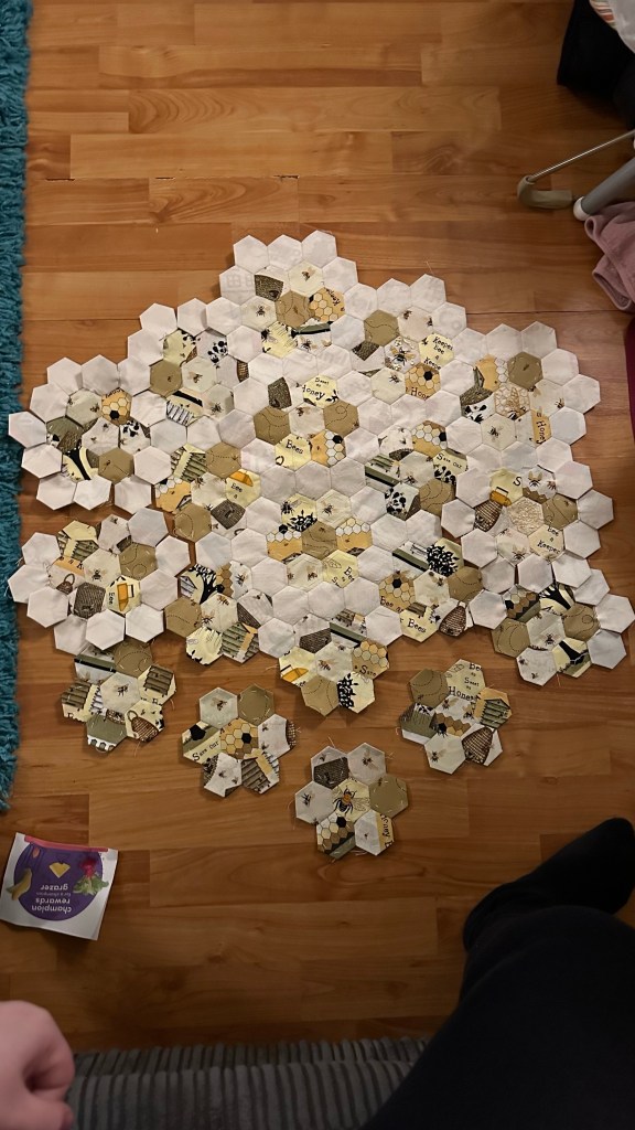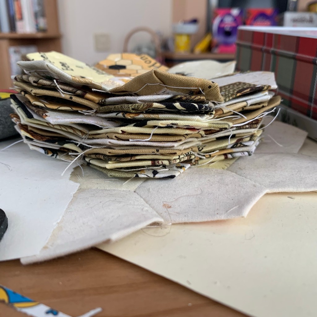 Three years ago today, in March 2020, I started making an English Paper Piecing (EPP) quilt using a pack of fat quarters I bought on eBay a while back. It’s honey bee themed, which I thought was great for the hexagon design I wanted to try.
