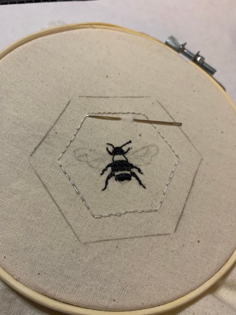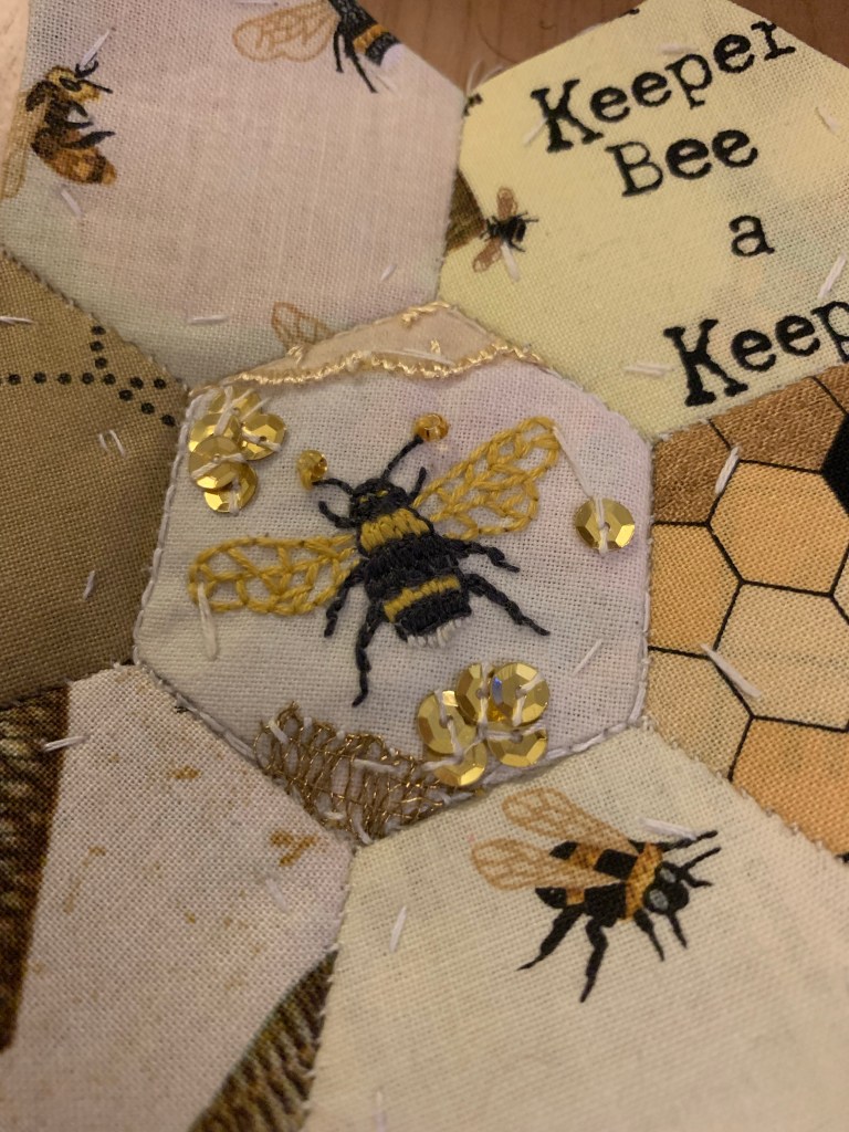 This is just an example of one the more special hexies I’ve included in my quilt, an embroidered bee on calico.
