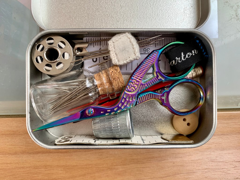 My tiny sewing kit I put together. It’s got everything you need on the go inside a tin the size of an altoid mint tin: